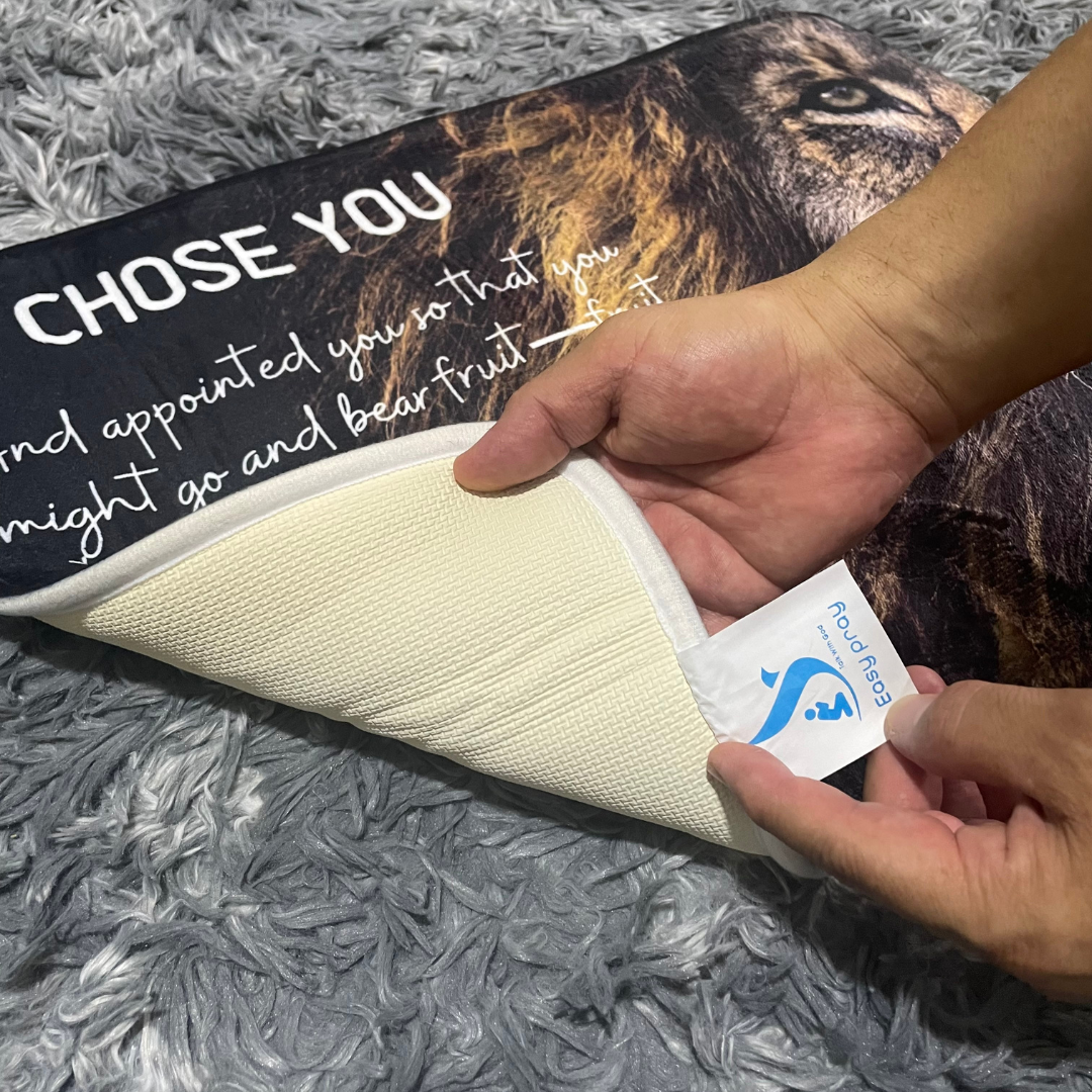 Measuring 16″ x 24″ inches, EasyPray Mat offers a comfortable and spacious surface for kneeling and deepening your spiritual connection. EasyPray Mat is adorned with powerful Bible verse, accompanied by a striking image of the Lion of Judah.