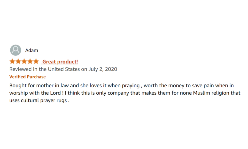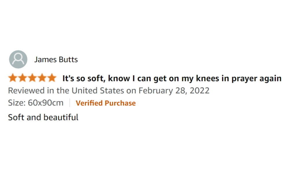 I had a broken kneecap and i could no pray on my knees until one day i tried my Easy Pray Mat. To my surprise i got up after an hour or more praying without pain. Thank you EasyPray.